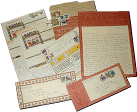 レイ監督夫妻からの手紙 長年に渡って築かれた信頼関係を物語るかのように、 かしこ宛てに送られたレイ監督夫妻からの手紙が、 今もなお数多く保管されています。 ![]() サタジット・レイ監督からの手紙。 ネーム入りの便箋で書かれています。 ![]() ビジョヤ・レイ監督夫人からの手紙。 インド的なデザインのかわいらしいレターセットで送ってくださいました。 |