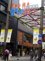 上映会場のほとんど、及びプレスセンター、JIFFスクエア(イベント会場)が集中するシネマストリートと呼ばれる通りは若者や家族連れでたいへんな賑わいを見せていた。特にシネマコンプレックス、メガボックス前ではバンド演奏やストリートパフォーマンスが行われたり、フリーマーケットが開かれたりと終始文字通りお祭りの様相を呈し、通行もままならない時間帯もあった。全州映画祭では毎年若手芸能人の男女ひとりずつが「映画祭広報大使」に任命され、広報活動にいそしみ華やぎと話題性を提供しており、今年は人気K-POPグループ、2AMのメンバー、イム・ソロンと女優ソン・ウンソ。ふたりの登場にファンのみならず居合わせた観客たちは大いに沸いていた。