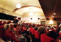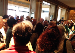| 上映後のロビー。 光の当たっている白髪カーリーヘアの 向こうにガニオン監督 |