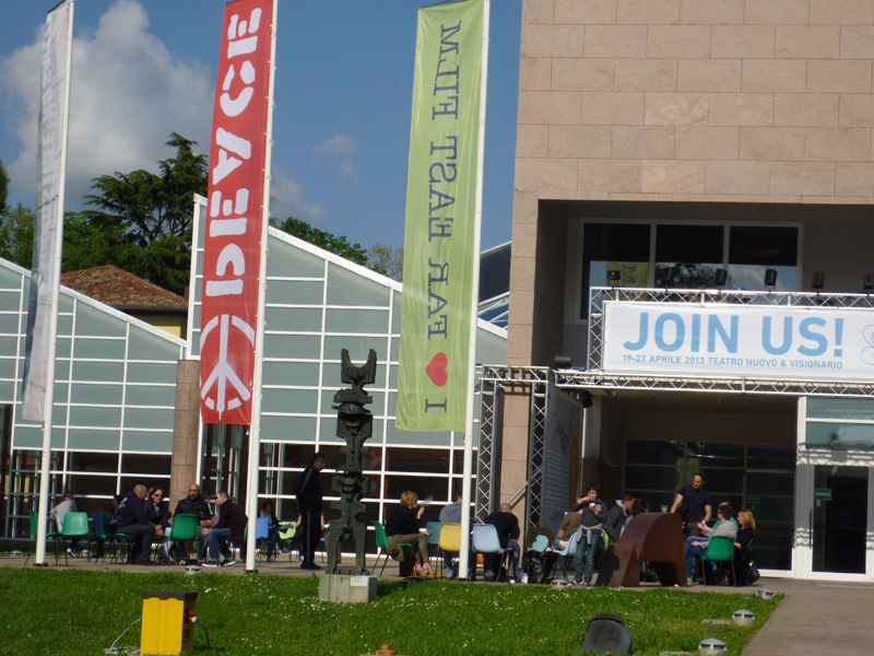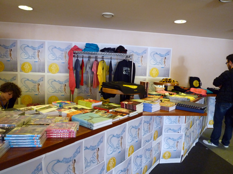 上映会場は市の文化の中心地ともいえるテアトロ・ヌーヴォ、一か所のみ(かつては2会場あったそうだが)。映画祭の時期以外は音楽会や演劇など、さまざまな文化活動に使用されているという。プレスセンターもゲストオフィスもすべてこの会場内にあり、記者会見も行われる。あちこち動き回らなくて良い、この場所に行けばほぼすべての参加者に会えるなど利点は多い。これから観る、または観てきたばかりの作品について語り合うちょっとしたカフェやラウンジも完備しており、上映の前後は特に人でごった返し、熱気を帯びる。平日も夕方以降は勤め帰りの人々も加わり、たいへんな人出となり、週末はさらなる混雑ぶりである。ただ1200名収容可能な大会場とはいえ、各作品の上映が一回だけなのはやはり残念なようにも思えてならない。全作品とはいわないまでも、二回上映の作品があっても良いのではないだろうか。会場内にはなかなかの広さを取って映画祭公式グッズ売り場が設けられ、気の利いたアイテムが所狭しと並んでいた。映画祭スタッフたちが着用していたエプロンも洒落ていて、観ていて心躍った。このあたりはさすがイタリア、である。