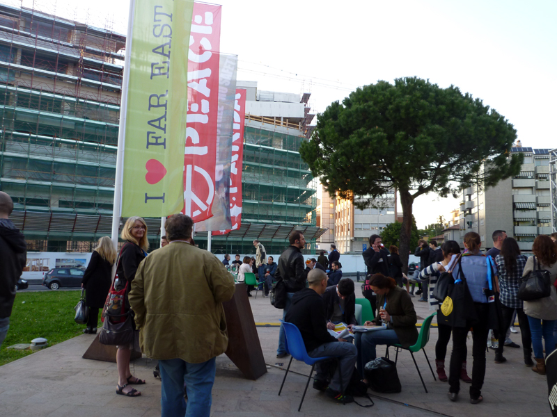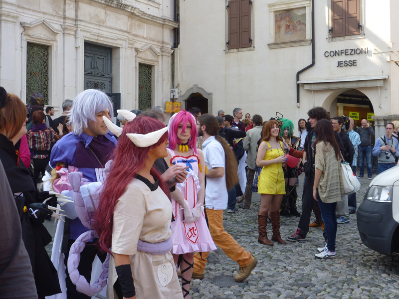 広く多くの人にアピールするであろうタイプのプログラムも功を奏し、今ではウーディネ市の一大文化行事として定着、支持を得ていることが随所から見てとれた。人口約10万人の落ち着いた佇まいの街は映画祭期間中は少々性格を変える。メイン会場テアトロ・ヌーヴォでの映画の上映のみならず、街の中心的な広場での「東洋の品マーケット」やアニメやゲームのキャラクター、ミュージシャンなどの扮装を競う「コスプレ・コンテスト」など、数々の個性的なイベントが繰り広げられ、多くの市民で賑わいをみせる。市内の飲食店も協力を惜しまない。映画祭の参加者にはハッピーアワーなど、さまざまな特典を用意している店も多く、それらの店のウィンドーには’Far East Off’と書かれたステッカーが貼られていた。加えて同映画祭の公式ポスター、もしくは’I Love Far East’ステッカーが市内中心部のほとんどの店のウィンドーを飾っており、映画祭及び来訪者を歓迎してくれている姿勢がうかがえた。