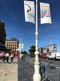 クルサールから徒歩数分の場所に位置するビクトリア・エウヘニア劇場脇の広場は、映画祭期間中は特別モニターが設けられ、クルサールでの記者会見の模様や到着したスターの姿などが映し出されたりしており、「映画祭広場」の様相を呈している。市民や観光客と思われる人々が足を止めてモニターに見入ったり、鑑賞した映画について広場内のベンチで語ったりしている様子が垣間見られた。各会場や道沿い、店先などには映画祭の種々のポスター(部門ごとに異なる)やバナーが飾られており、町中が映画祭モードに包まれている。町の人と話す機会が何度かあった中で、映画祭の存在を大いに歓迎しているとの意見がとても多かった。日本人の監督からも「街を歩いていると、お客さんがどんどん声を掛けてくれ、熱心に映画の感想を言いに来てくれた」といった話を聞いた。街と一体感のある映画祭。映画祭のあるべき姿をみているように思われた。