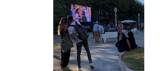 映画祭広場。特設モニターに見入る市民たち |