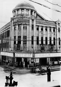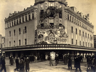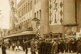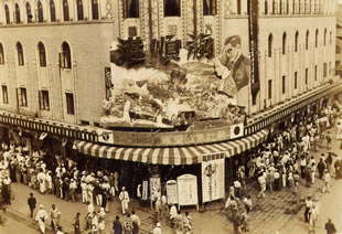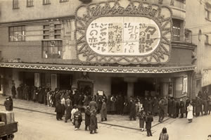 上映作品は「シンギング・フール」(1929年製作・1930年公開/ロイド・ベーコン監督) 初トーキーと言われる「ジャズ・シンガー」 (1927年製作・1930年公開/アラン・クロスランド監督)の予告看板が見えます。 |