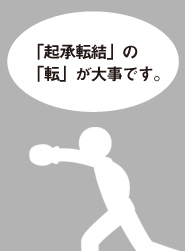 シナリオ構成について、昔から「起承転結」という言葉が言われています。「起」の部分は物語の設定や登場人物の紹介をするわけですが、最近のシナリオでは、いきなりドラマを始めてしまい、ストーリーの展開の中で説明していくという方法が採られています。テレビが始まってチャンネルを変えられないために出来るだけ早くストーリーに入りたいと思うようになったからかも知れません。「承」の部分では見る人をなるべくスムーズに引き込むことを考えなければなりません。主人公はこれからどうなるのだろうと興味を抱かせるのです。そして「転」。シナリオの中で、ここが一番大切です。思い切ったアイディアを出して、主人公の人生を変えて下さい。刑事ものでいうと、犯罪の種類を知らせるのが「起」であり、捜査活動が「承」、犯罪の全貌が分かるのが「転」、そして、犯人逮捕が「結」です。ただし、これは基本形で、この形を崩して構成していかないと観客は満足してくれません。一つのストーリーの中に、いくつも「転」があったり、犯人に逃げられてしまうのが「結」だったりします。ただ、「転」は観客の意表を突くものであることが必要であり、「結」は観客が見終わって納得するものでなくてはなりません。